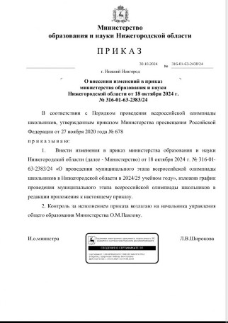 Приказ Департамента образования Кстовского муниципального округа от 17.09.24 "О внесении изменений в приказ ВсОШ от 09.09.24"
